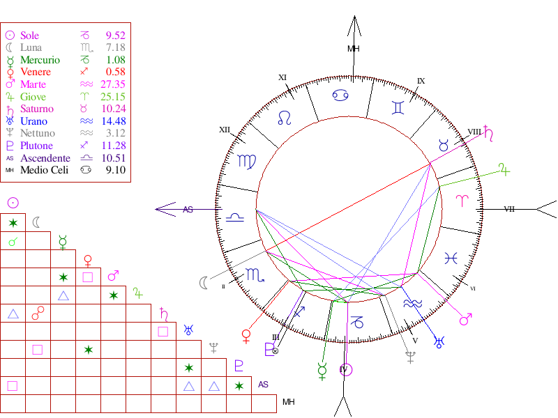 Enzo Biagi, con il suo aspetto gentile e modesto che l’ascendente Vergine ci mostrava, aveva però Marte in Scorpione in trigono a Plutone in X casa, una grande forza ma anche un’ambizione che gli ha permesso di confrontarsi con tutti i potenti della storia moderna, anche se il suo tema ci sottolinea con la quadratura al Sole/Nettuno che in rapporto con il potere non era facile, né dentro di sé né quindi nel mondo.